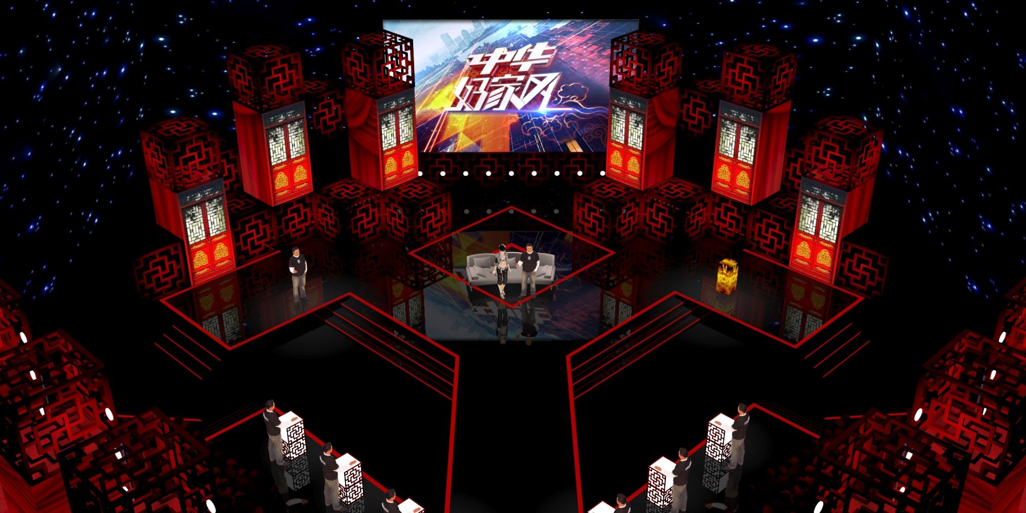 首先,演播室吊掛采用全景區(qū)的設(shè)計(jì)方式,不再考慮固定的觀眾席;