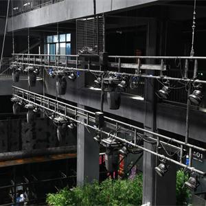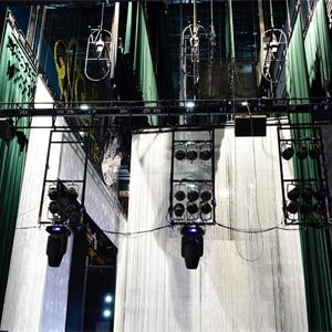 在燈架下沿,每側(cè)配若干套“日”字型燈光排架,用于懸掛燈具,燈光排架可手動(dòng)使之在垂直臺口方向移動(dòng),燈架可整體升降。燈光排架可根據(jù)需要上下疊加。也有用雙層燈光吊桿桿體硬聯(lián)接組成的掛燈結(jié)構(gòu)。