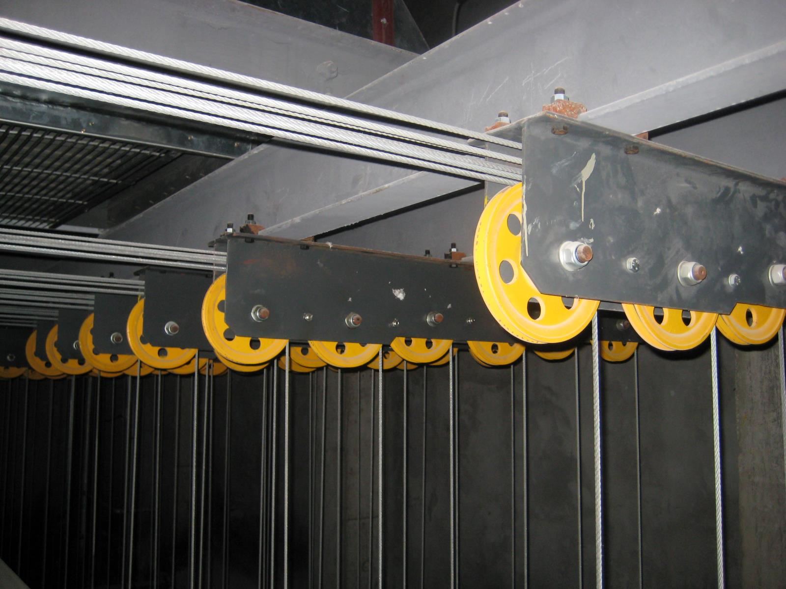 卷揚(yáng)系統(tǒng):包括電動機(jī)、減速器、雙制動器、卷筒、滑輪組件、鋼絲繩和配件、輔助操作手輪等?;喗M件(一般)包括拐角滑輪、吊點(diǎn)滑輪。