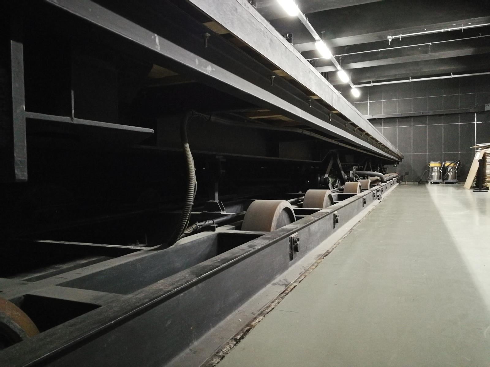 芭蕾舞車(chē)臺(tái)由安裝在鋼架的支撐輪和2個(gè)齒輪架上(齒條驅(qū)動(dòng)時(shí))的鋼結(jié)構(gòu)桁架組成。外部驅(qū)動(dòng)裝置隱藏在芭蕾舞車(chē)臺(tái)臺(tái)體和主升降臺(tái)臺(tái)面之下。與臺(tái)車(chē)下部的齒條嚙合,向臺(tái)車(chē)傳送動(dòng)力。由設(shè)置在第三、四塊主升降臺(tái)上的驅(qū)動(dòng)裝置通過(guò)接力技術(shù)完成整個(gè)行程驅(qū)動(dòng)?;蚩捎呻妱?dòng)摩擦輪提供行走動(dòng)力。