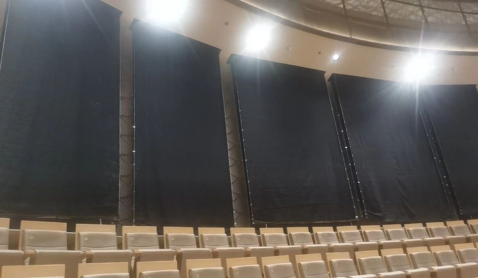 卷幕吸聲式聲學(xué)裝置通常設(shè)置于觀演區(qū)的兩側(cè)、后區(qū)或頂部,利用吸聲簾幕的升降改變吸聲或反射面積??梢园惭b于裝飾墻面外側(cè)(明裝),也可以安裝于透聲墻面與建筑墻體之間的聲學(xué)構(gòu)造內(nèi)(暗裝)。通常卷幕吸聲式聲學(xué)裝置數(shù)量較多,故一般配置獨(dú)立控制系統(tǒng)。